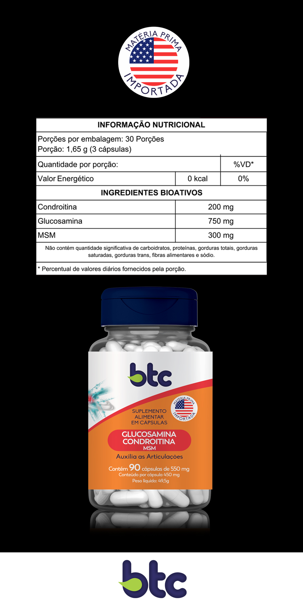 Sulfato de glucosamina com cloreto de potássio, metilsulfonilmetano (MSM), sulfato de condroitina produzido a partir da fermentação de Escherichia coli, dióxido de silício, estearato de magnésio e silicato de magnésio. CÁPSULAS: Gelatina, dióxido de titânio (INS 171) e água purificada.