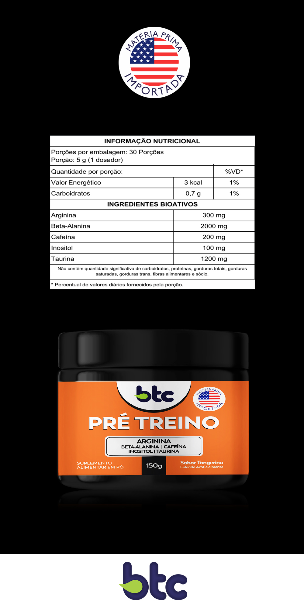 Beta-alanina, taurina, maltodextrina, L-arginina, isomaltulose, cafeína, inositol, aroma idêntico ao natural de tangerina, ácido cítrico, ácido tartárico, goma guar, dióxido de silício, citrato de sódio, edulcorantes stevia e sucralose e corante artificial amarelo crepúsculo (INS 110). NÃO CONTÉM GLÚTEN.